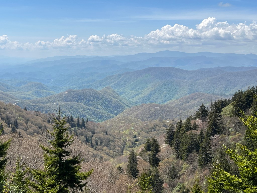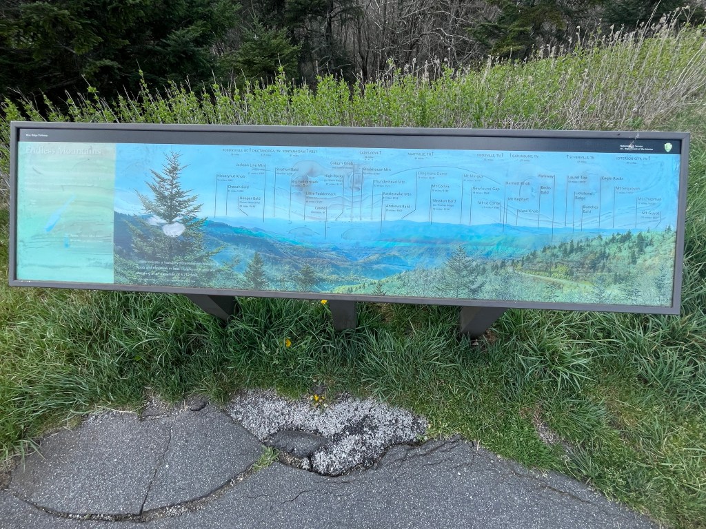 I received my backup key from FedEx just before noon and got “On the Road Again,” a la Willie Nelson. I drove back through the infamous tunnel in the Cumberland Gap National Park where my first key was destroyed and drove through the Cherokee National Forest in Tennessee and along the edge of the Great Smoky Mountains National Park on the way to a short stretch of the Blue Ridge Parkway up to the Waterrock Knob Visitor Center. From there, the dogs and I took a two mile hike uphill (very rocky) and back down on the Waterrock Knob Overlook. The juice was worth the squeeze as the view of the Appalachians was magnificent. If you can zoom in on the sign I posted, it shows that you could view mountains well beyond twenty miles. And from the other scenic picture I posted, you can see why this portion of the Appalachians is called the Blue Ridge Mountains, stretching from Pennsylvania down to Georgia.