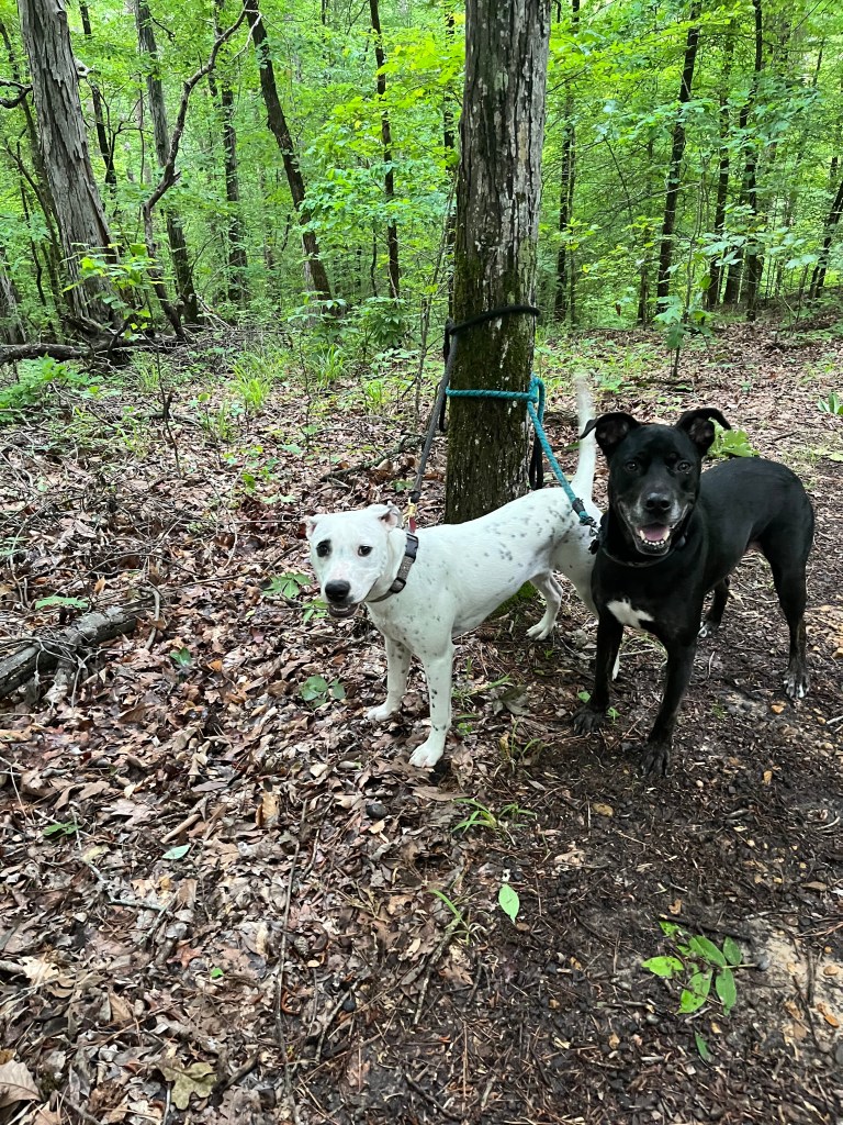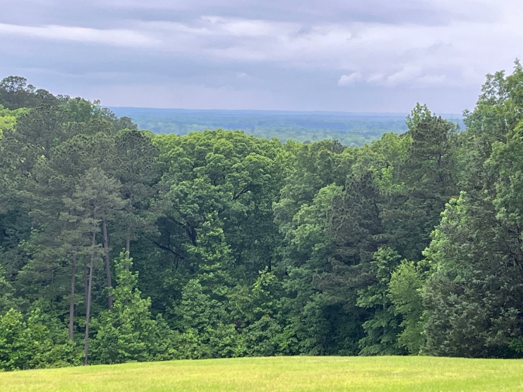 Close to the halfway point is the Jeff Busby Overlook and Campground. It is the second and last first-come-first-serve campground on my journey. (The first on Day 1 didn’t work out too well as it was full, and I ended up in a Walmart parking lot for the night.) But this campground was wide open when I arrived. It is very much a no-frills site, with no electricity or water hookups, and only rest rooms, but that was enough for me. I took the dogs on a two mile hike up the “Little Mountain Trail” leading up to the Jeff Busby Overlook, which is purportedly one of the highest elevations in the state. The overlook view was okay, but nowhere near as spectacular as the Appalachian overlooks I visited earlier on the trip. The hike was good for the dogs. Gipper understands the concept of a trail and stays mostly on the path. Madison tries to pull me left and right and wants to chase birds and butterflies.