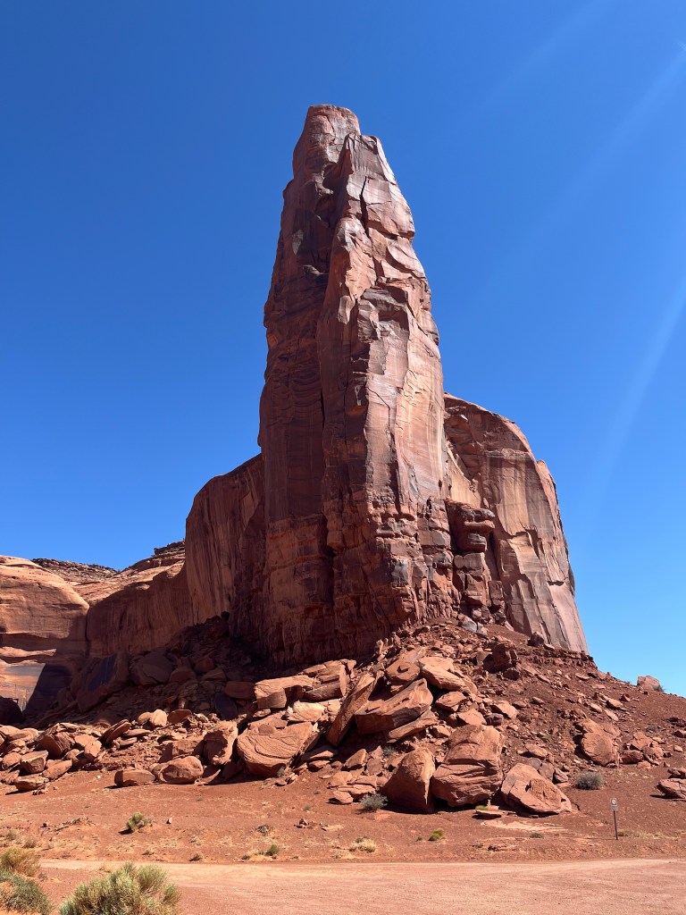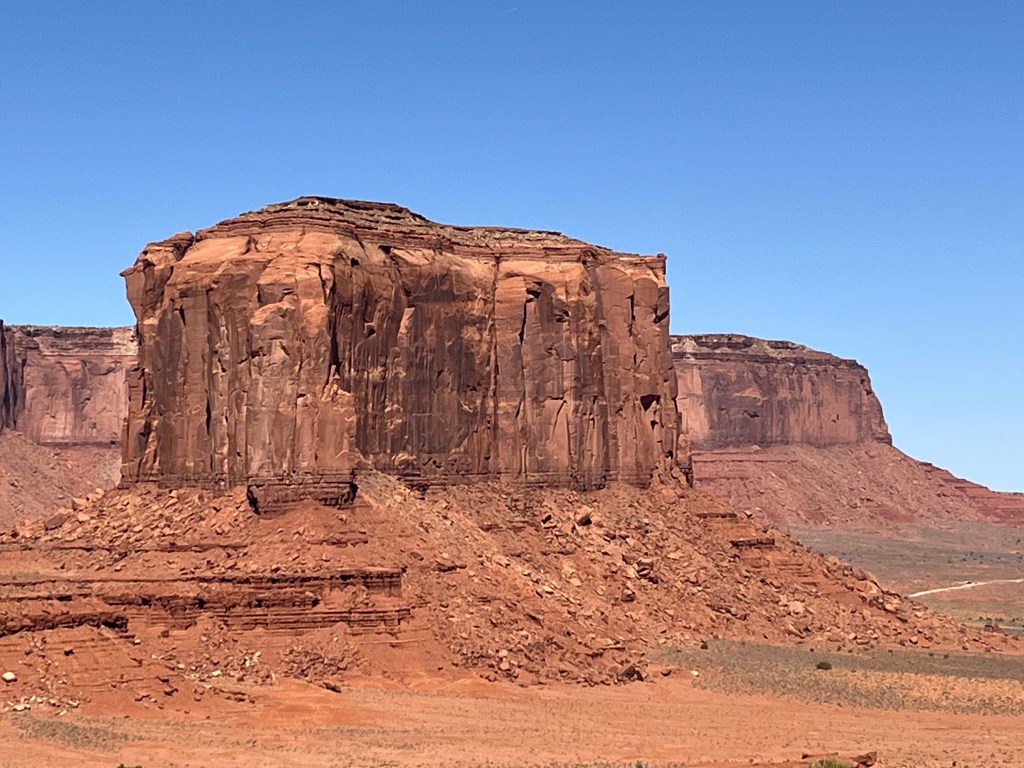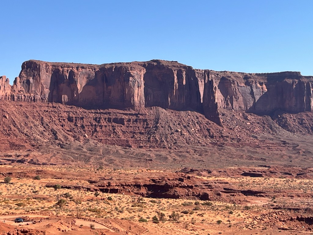 As I headed down U.S. 191 in Utah, I entered the Navajo Nation, which is the largest Indian reservation in the United States, exceeding the size of ten U.S. states, and spanning parts of New Mexico, Utah, and Arizona, with a population of over 165,000. At Bluff, Utah, I turned onto U.S. Highway 163, and took the photo posted above at milepost 13, near Mexican Hat, Utah, before continuing on into Arizona. Just inside the border, the road was designated the Kayenta-Monument Valley Scenic Road in Navajo County. I soon turned off into the Monument Valley Navajo Tribal Park, a Navajo entity equivalent to a U.S. national park, and considered to be sacred land. I took the dogs on a two-mile hike on one of the trails. I then had to unhook the trailer in the parking lot so that I could drive the 17-mile loop within the park and view the magnificent buttes. The road was extremely bumpy and very hard on brakes, tires and suspensions. But overall, the park was, well, monumental.