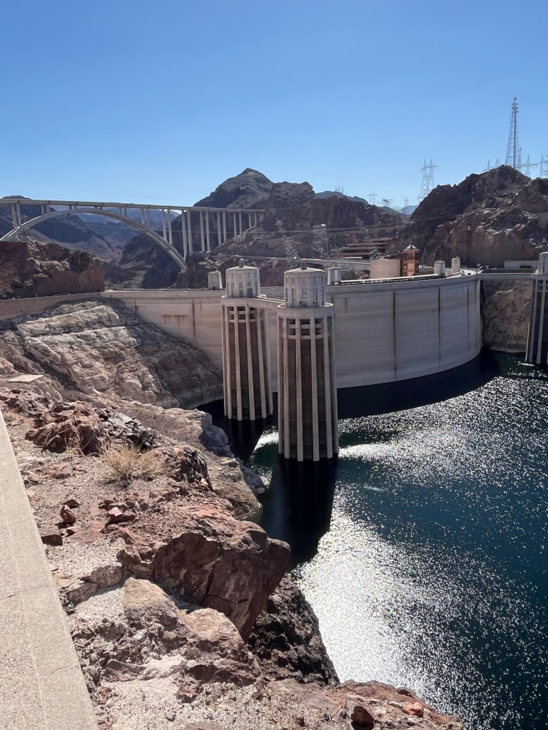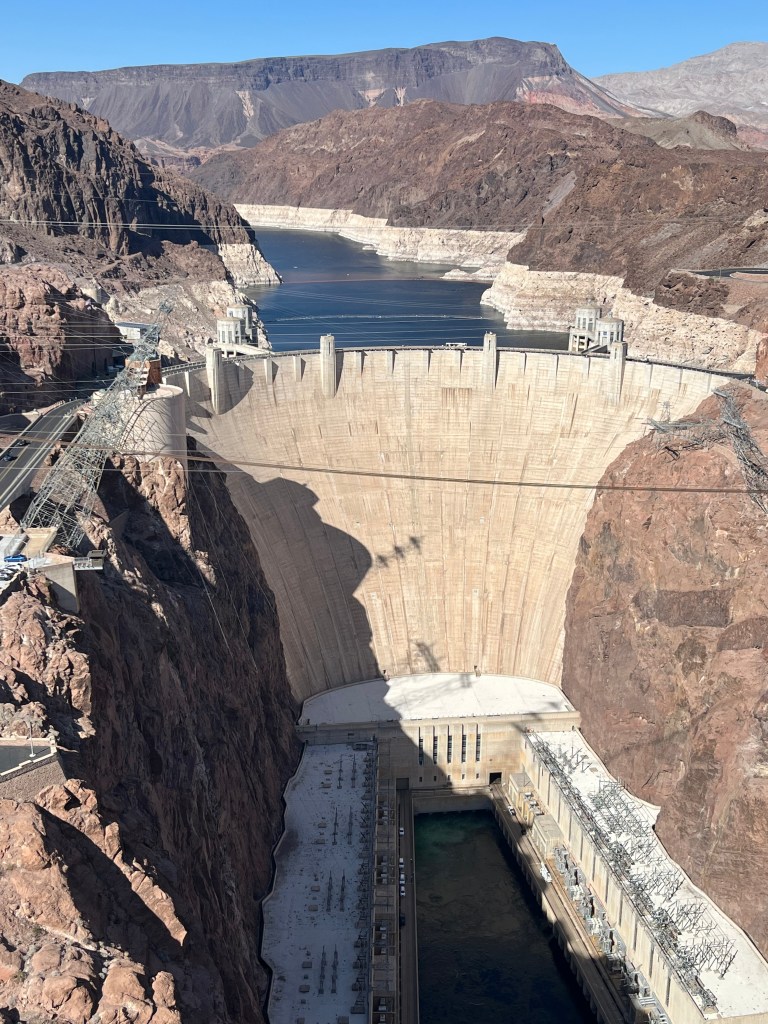 I had to drive across the dam to the Arizona side for the parking areas that can accommodate RVs and trailers. From there, I took photos from the back of the dam, including one looking back at Lake Mead. In the photo of the dam from the back you can see the Mike O’Callaghan–Pat Tillman Memorial Bridge that connects Arizona and Nevada and is part of the Hoover Dam bypass highway. It adds to my list of “firsts and mosts” as it was the first concrete-steel composite deck arch bridge built in the United States and incorporates the widest concrete arch in the Western Hemisphere. It is the second highest bridge in the United States after the Royal Gorge Bridge near Cañon City, Colorado. I was able to walk up to the bridge for the overlook photo of the front of the dam.