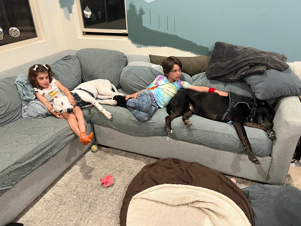 I left Lake Mead for California, and as soon as I crossed the state line, gas prices were significantly higher, as I paid more than $5 per gallon. The drive was long and uneventful and I arrived in San Marcos at the home of my son, Marshall, and his girlfriend, Alex, as well as my two grandchildren, Eion and Rosette. As you can see from the photo, the dogs were very tired from the long, hot drive.
