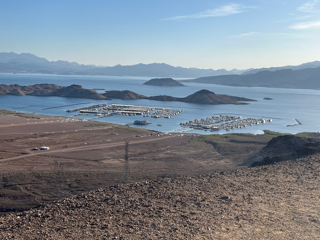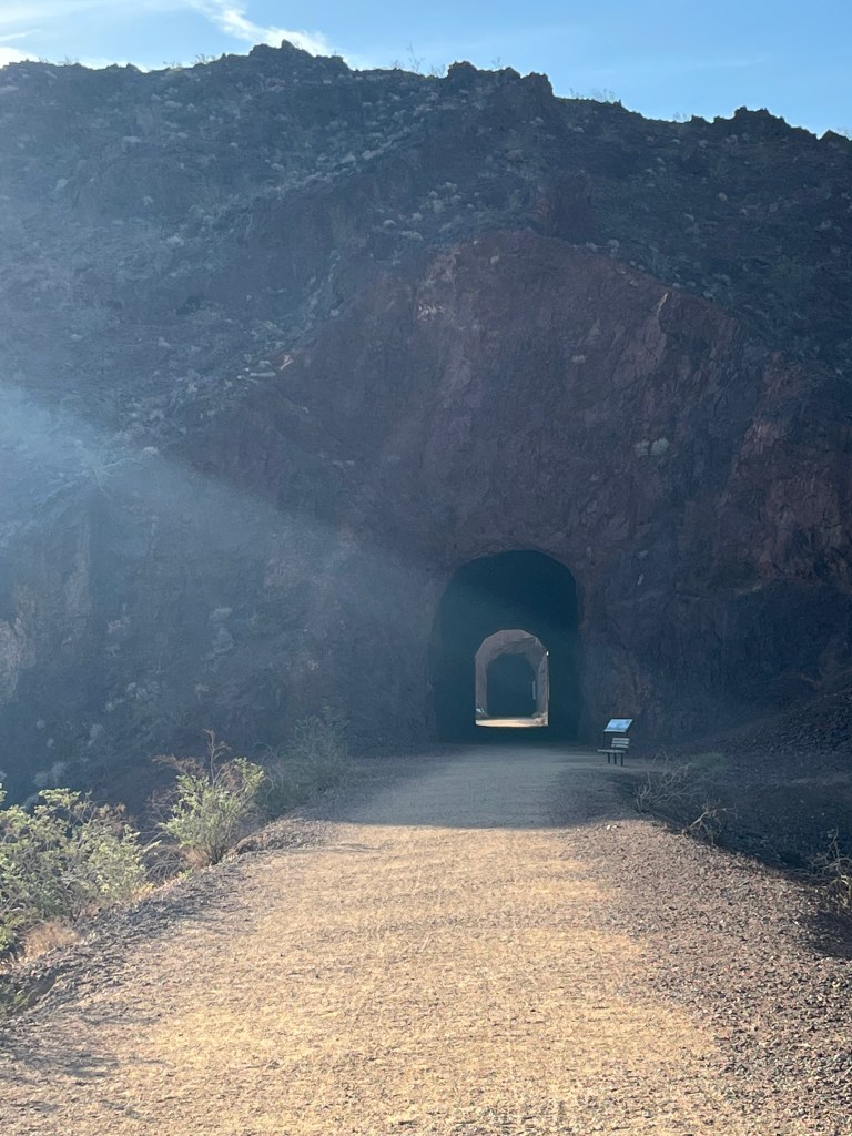 Following the suggestion from the clerk at the Lake Mead Visitor Center, I got up early (see the posted sunrise picture) and we took a three-mile hike on the Historic Railroad Trail. It is a much longer trail than that but we stopped at the first tunnel, since it was still very hot, even at 7:00 AM. But from the trail we could see most of the Lake Mead area, including the location of my campsite.