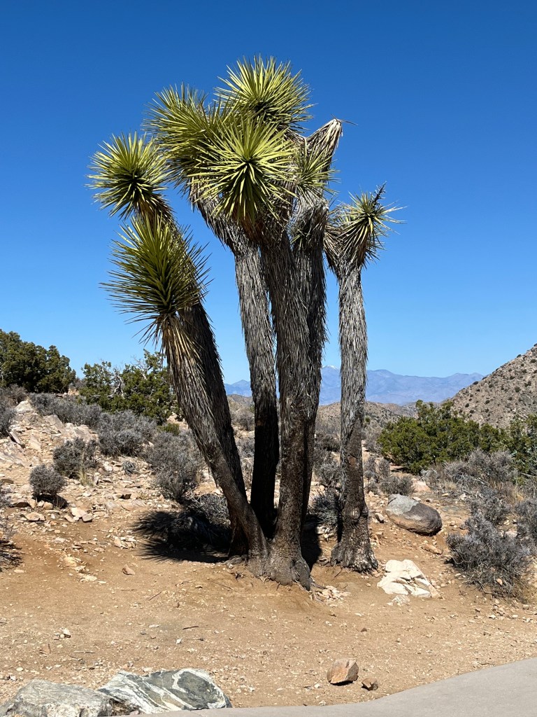 I camped in Joshua Tree National Park in my trailer; Marshall, Alex, kids and Alex’s mother Ann camped in the adjoining site in Alex’s pop-up trailer. We arose early on Saturday and spent the day exploring the park, which has millions of these unique plants, which legend says were named for the biblical figure Joshua by 19th-century Mormon settlers who felt the outstretched tree limbs guided them along their westward journey. But, botanically speaking, they aren’t really trees; they are apparently yuccas. While they share the general form of a tree with a single trunk and branches, their internal structure and growth patterns are more similar to other yuccas than to true trees.