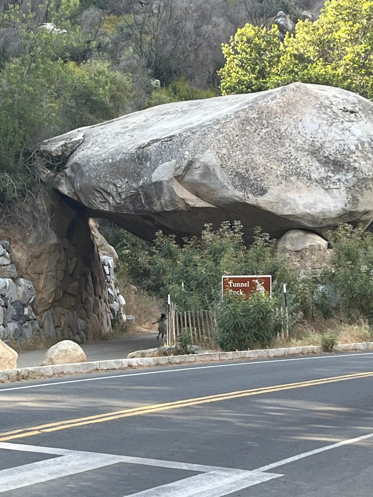 My ultimate destination was the Sequioa National Park, renowned for mountains, rugged foothills, deep canyons, caverns, and the world’s largest trees. I arrived near my campsite at 5:30, and decided to go see the General Sherman Tree before I settled in, not knowing it would be a 50-minute drive through the park to get to the location of the tree. The route was also a winding road, rising in elevation from 2,000 feet to over 7,000 feet. (I have already stated in previous blogs how much I dislike these curving, rising roads with little space to squeeze by the cars driving in the opposite direction.)