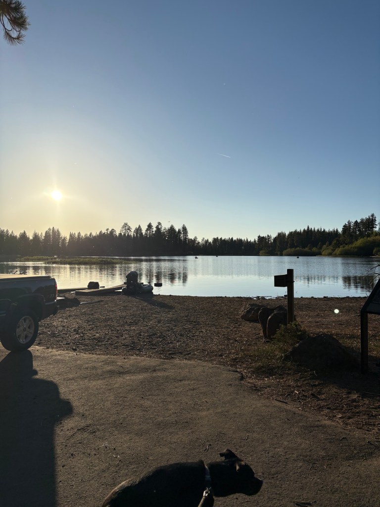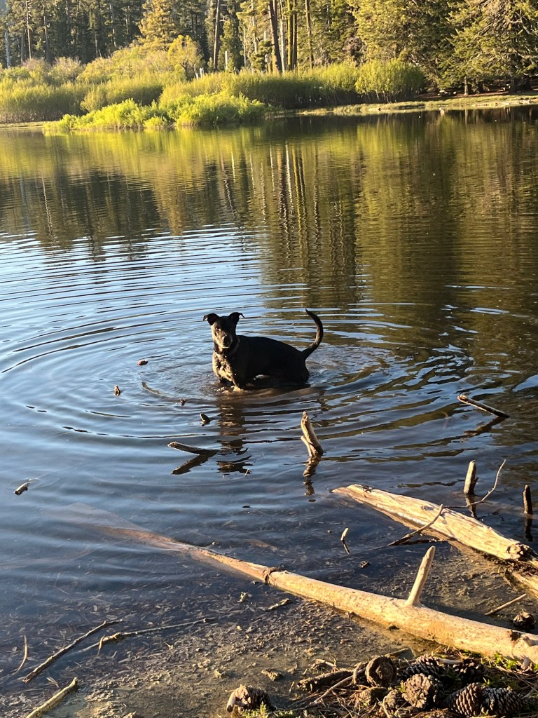 We drove a long way up to our campsite for the night at the Manzanita Lake Campground in the Lassen National Park. We took a short walk to the lake (very nice) and Sean made the mistake of tossing a pinecone into the lake. Gipper immediately yanked the leash out of my hand and jumped in the lake to find it.