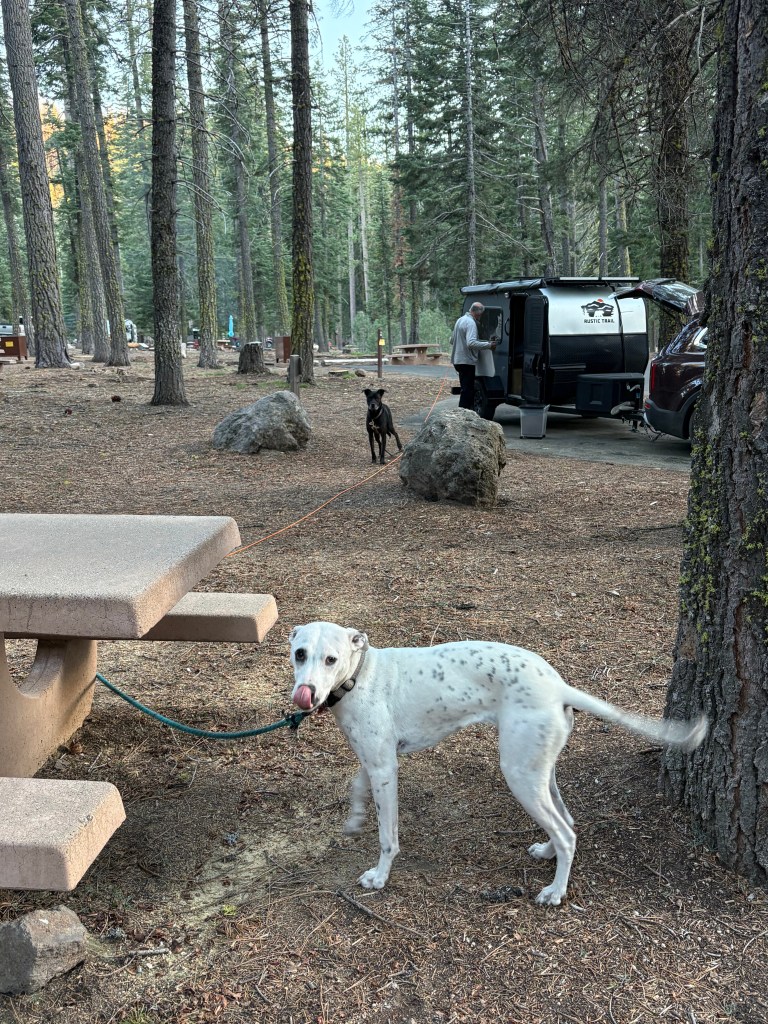 I then drove to the Sacramento Airport and picked up Sean, who flew in from Charleston to join me for a week. We took a long drive to the Upper Bidwell Park, which also included an 8 mile drive over an incredibly bumpy rode, driving mostly 10 MPH or less. I don’t think this excursion was worth it, although the park had an interesting creek and rocky path that we used for a 1.5-mile hike with the dogs. We passed a middle-aged man walking his dog who explained the park has been a popular hangout for teens for decades.