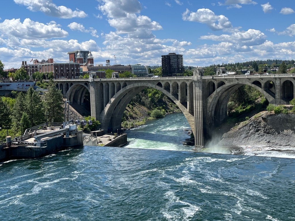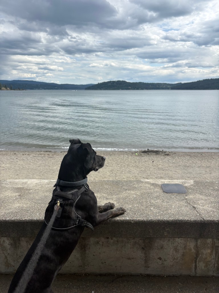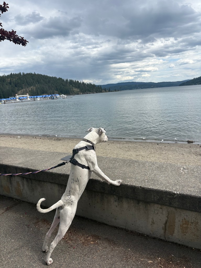 The first four pictures are from Spokane. The second four are from Coeur d’Alene, including the dogs enjoying the views from the lake. We had to hold Gipper back from taking a seven-foot jump down from the wall to the beach.