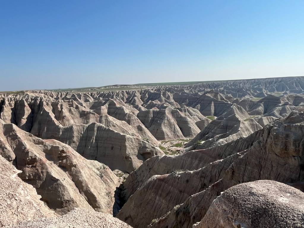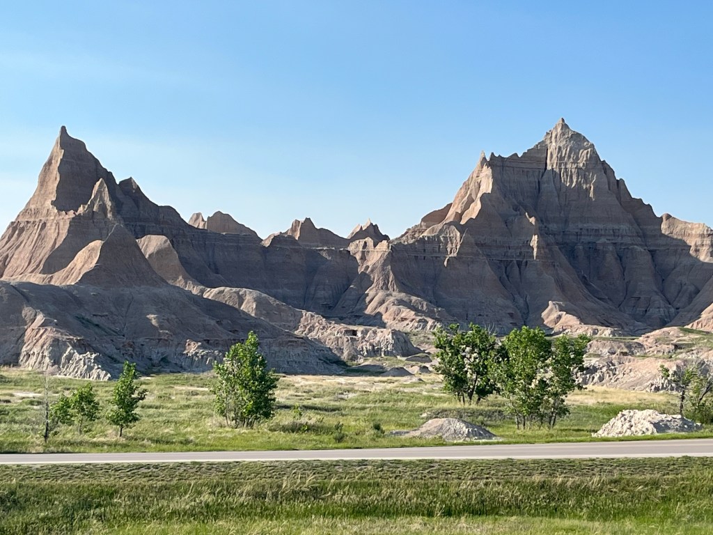 Once again, the dogs woke me up at 5:30, so I walked them, fed them, and cooked eggs for myself. I left the Cedar Pass Campground and drove through the loop in Badlands National Park for an hour. It is supposed to have bison, bighorn sheep, prairie dogs, and ferrets, but I didn’t see any. I did see incredible rock formations. The term “badlands” is a geologic term used to describe terrains typically characterized by soft sedimentary rocks that erode easily. There are badlands in Wyoming, Utah, North Dakota, Colorado, and Nebraska (some of which I have already seen), but I doubt they are as amazing as the ones here. I must have taken 50 photos, but I only posted a few here, including one from the Big Badlands Overlook that spans a large area of the park.