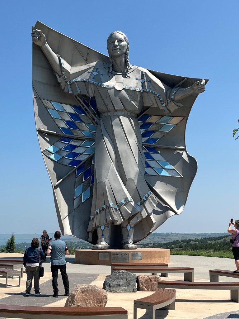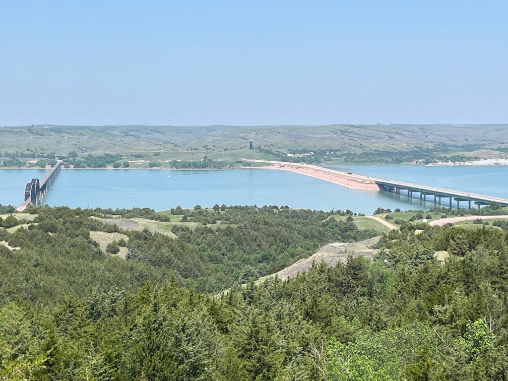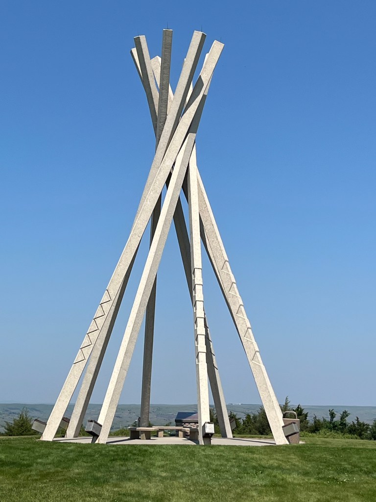 I then headed east along I-90. When I crossed over the Missouri River, I pulled off at the Chamberlain Rest Stop and Visitor Center, which offers a stunning view of the river and provides information on the many Native tribes from the area, including nine subsets of the general Sioux Tribe. In 2016, they constructed the large metal Dignity of Earth and Sky statue. The picnic area includes a concrete tipi structure, similar to those seen at other South Dakota rest stops. The other emphasis of the Visitor Center is the history of the Lewis and Clark expedition which crossed the river nearby on the westward journey and on the return.