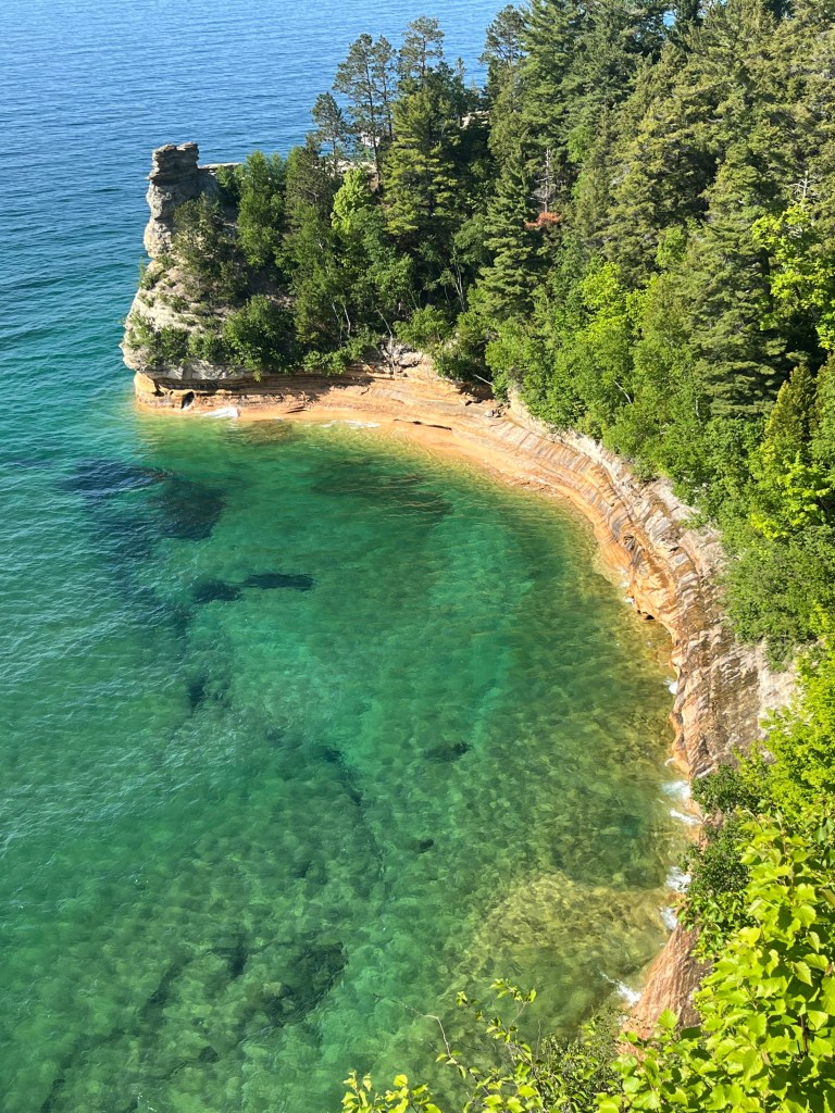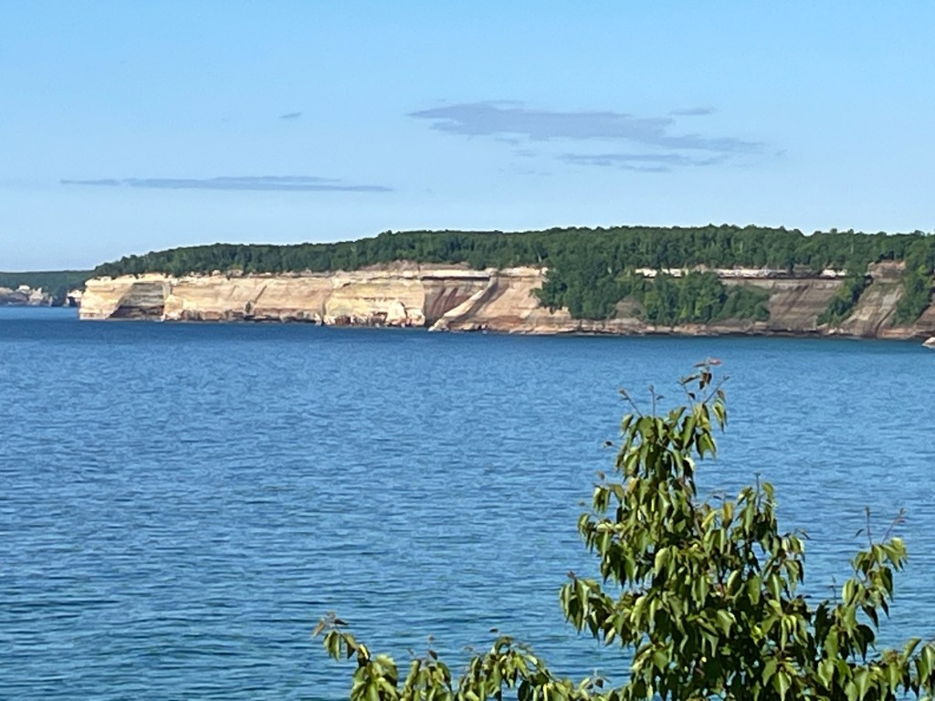 I then drove further north and crossed into Michigan, driving along the edge of Lake Michigan most of the way. Sean had suggested that I include the Upper Peninsula in my trip plans, and I understand why. I entered the Pictured Rocks National Lakeshore, which stretches for more than 50 miles along the shoreline of Lake Superior. I first went to the Munising Falls Visitor Center to get my bearings. The information clerk suggested I visit Miners Falls and Miners Castle and if I had more time (I did not), I should drive for another hour eastward to see the Twelve Mile Beach. I took the dogs for a 1.5-mile hike to the Miners Falls, and then drove to the cliffs to see Miners Castle, which is a rock formation overlooking the lake. The dogs were particularly annoying on the hike, as they slowed down to smell everything on the trail through the forest. The castle offered great views of the lake as well as the Miners Beach area.
