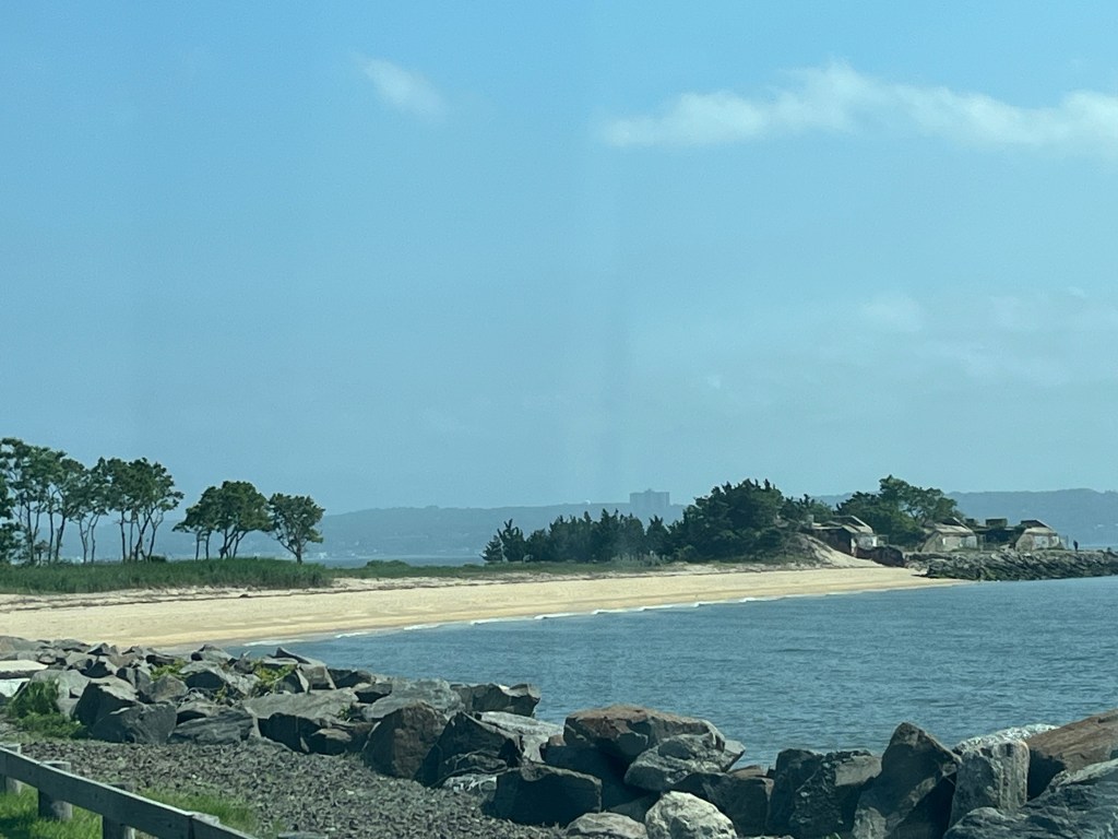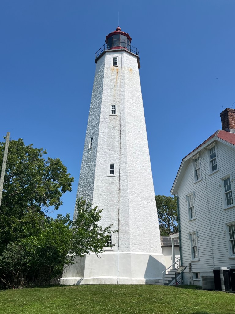 I drove up around New York City through Yonkers and down into the city far enough to cross over the Hudson River into New Jersey on the George Washington Bridge. I headed down south first to the Gateway National Recreation Area, so called because it is the gateway to New York Harbor. It spans parts of New York City as well as the Sandy Hook area, which is a barrier beach peninsula located at the northern tip of New Jersey’s shoreline. This latter area was my destination, and I drove up to the northern edge to walk the dogs and visit the Sandy Hook Lighthouse, which is the is the oldest working lighthouse in the United States (constructed in 1764), and is on the National Register of Historic Places. The peninsula also houses active beach areas on both the ocean side and the bay side, as well as the historic remains of Fort Hancock, with many empty barracks.